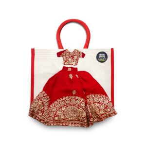 This is an jute bag designed with keeping women essence in ind during ancient times with red zardozi work with Indian traditional wear ghaghra choli. A multi dunction usable bag from wedding to kanjkanya giveaways .